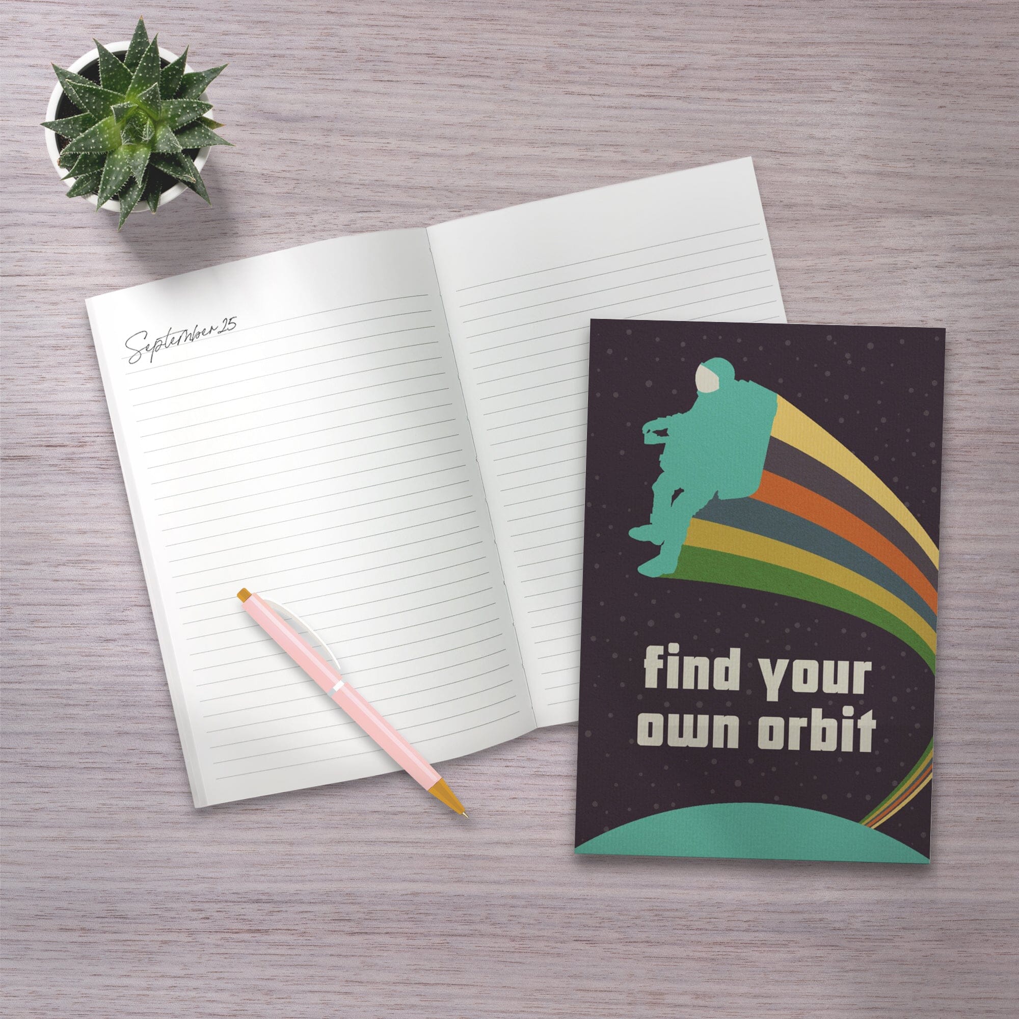 • Lined 6x9 Journal, Space Is The Place Collection, Rainbow Astronaut With Jetpack, Find Your Own Orbit, Lay Flat, 193 Pages, FSC paper